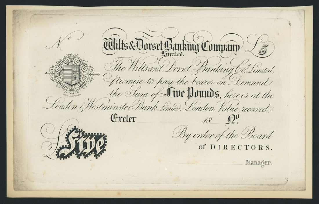 Wilts & Dorset Banking Company Limited, proof £5, Exeter, dated 18--, the Wilts & Dorset Banking Company Limited circa. 1883-1914 is listed under Outing 1890 for Salisbury, which is the Head Office for this bank. This bank is unlisted in Outing in association with Exeter, obverse and reverse designs,