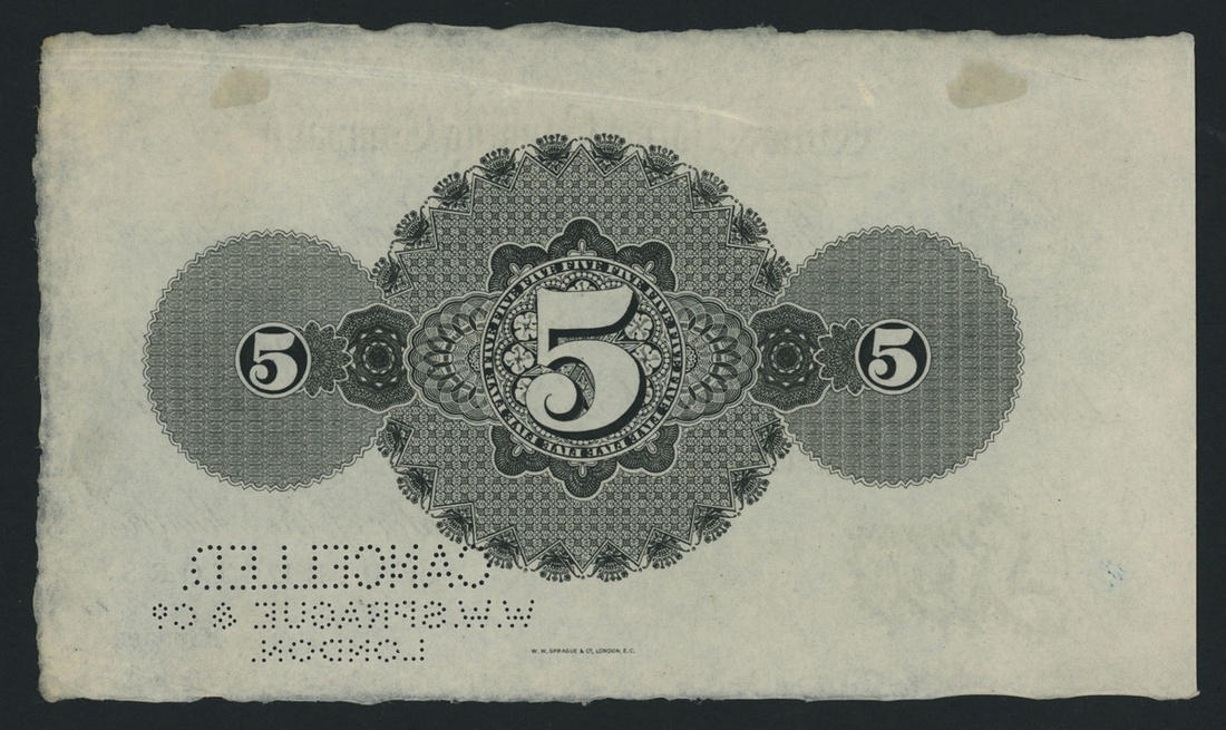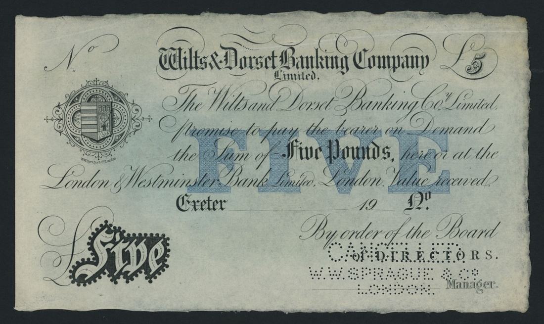 perforated 'CANCELLED W. W. SPRAGUE', the Wilts & Dorset Banking Company Limited circa. 1883-1914 is listed under Outing 1890 for Salisbury, which is the Head Office for this bank. This bank is unlisted in Outing in association with Exeter, obverse and reverse designs,