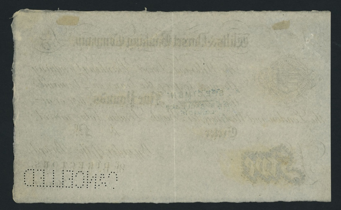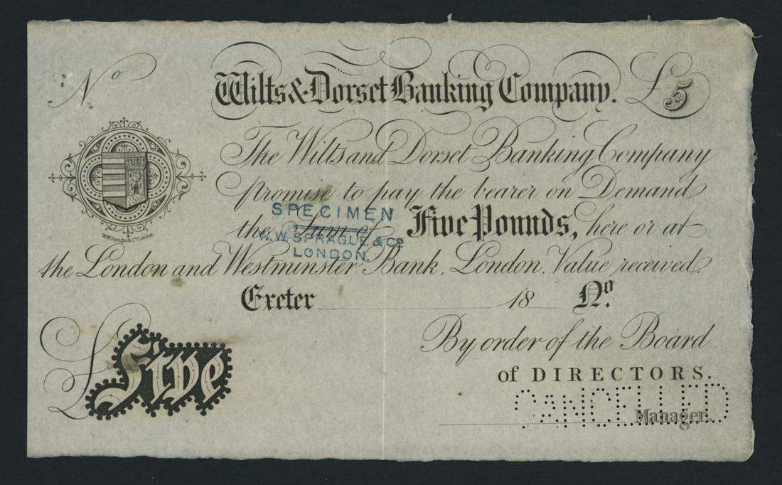 perforated 'CANCELLED, stamped 'SPECIMEN W. W. SPRAGUE', the Wilts & Dorset Banking Company circa. 1835-1883 is listed under Outing 1890 for Salisbury, which is the Head Office for this bank. This bank is unlisted in Outing in association with Exeter, uniface,