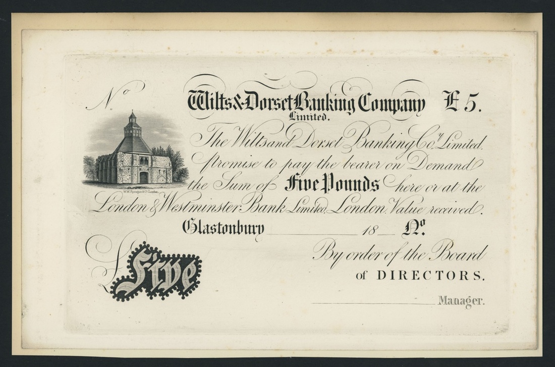 Wilts & Dorset Banking Company Limited, proof £5, Glastonbury, dated 18--,
