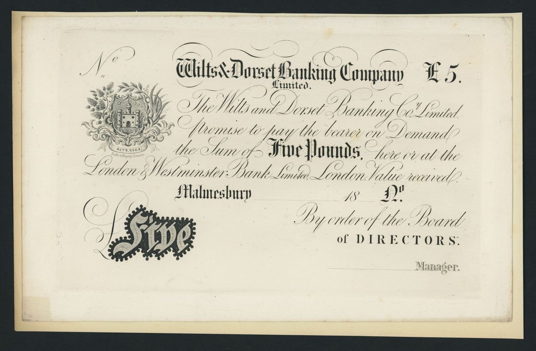 Wilts & Dorset Banking Company Limited, proof £5, Malmesbury, dated 18--, the Wilts & Dorset Banking Company Limited circa. 1883-1914 is listed under Outing 1890 for Salisbury, which is the Head Office for this bank. This bank is unlisted in Outing in association with Malmesbury, uniface,