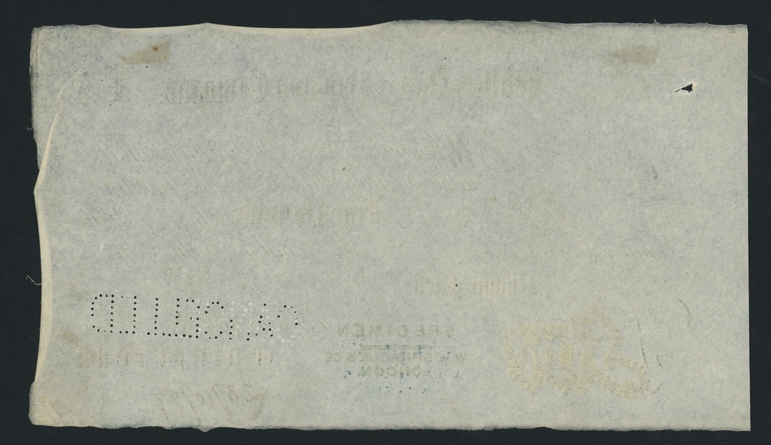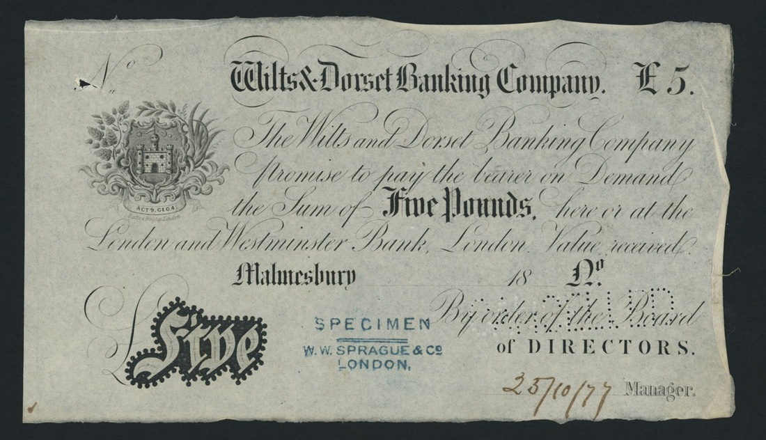 Wilts & Dorset Banking Company, specimen £5, Malmesbury, dated 18--, perforated 'CANCELLED' and stamped 'SPECIMEN W. W. SPRAGUE', the Wilts & Dorset Banking Company circa. 1835-1883 is listed under Outing 1890 for Salisbury, which is the Head Office for this bank. This bank is unlisted in Outing in association with Malmesbury, uniface,