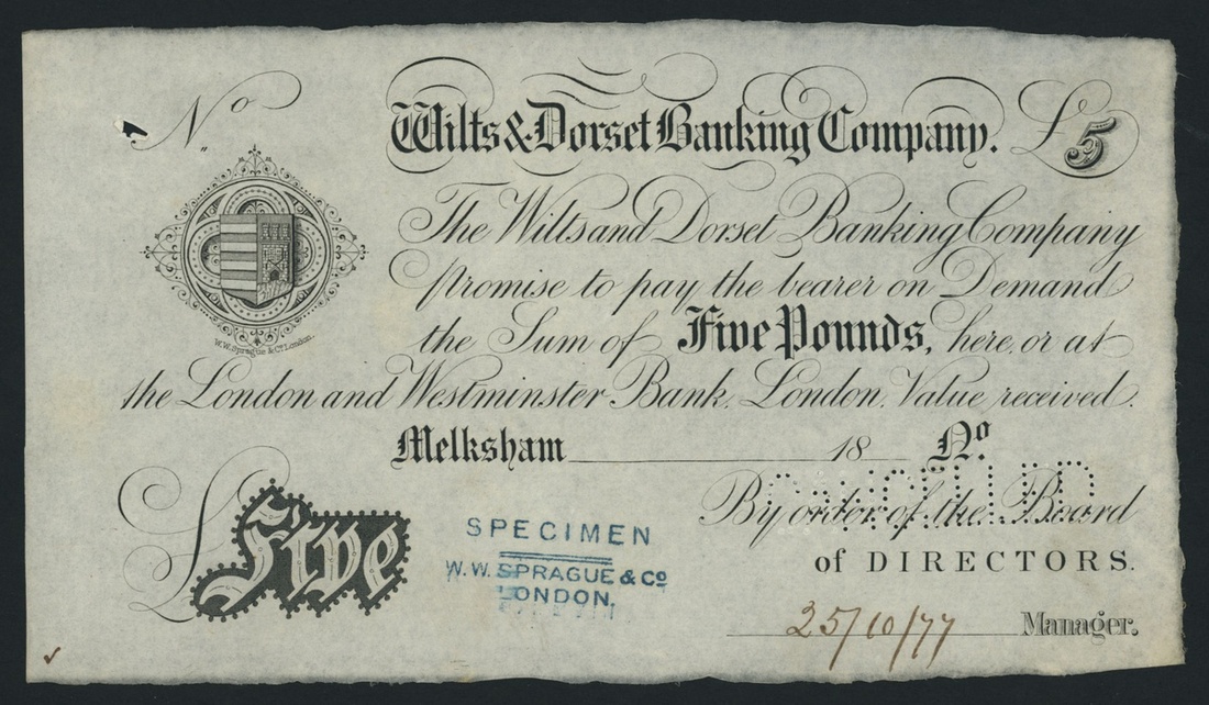 Wilts & Dorset Banking Company, specimen £5, Melksham, dated 18--, perforated 'CANCELLED' and stamped 'SPECIMEN W. W. SPRAGUE', the Wilts & Dorset Banking Co. is listed circa. 1835-1883 is listed under Outing 1890 for Salisbury, which is the Head Office for this bank. This bank is unlisted in Outing in association with Melksham, uniface,
