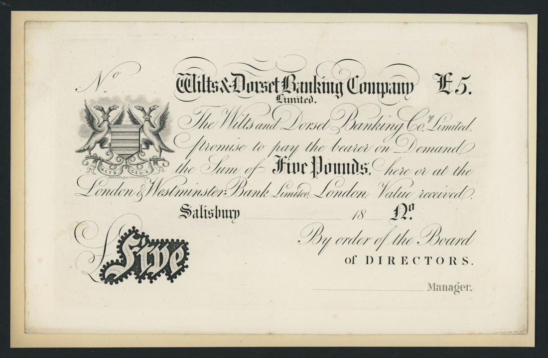 Wilts & Dorset Banking Company Limited, proof £5, Salisbury, dated 18-- the Wilts & Dorset Banking Company Limited is listed circa. 1883-1914 under Outing 1890, uniface,