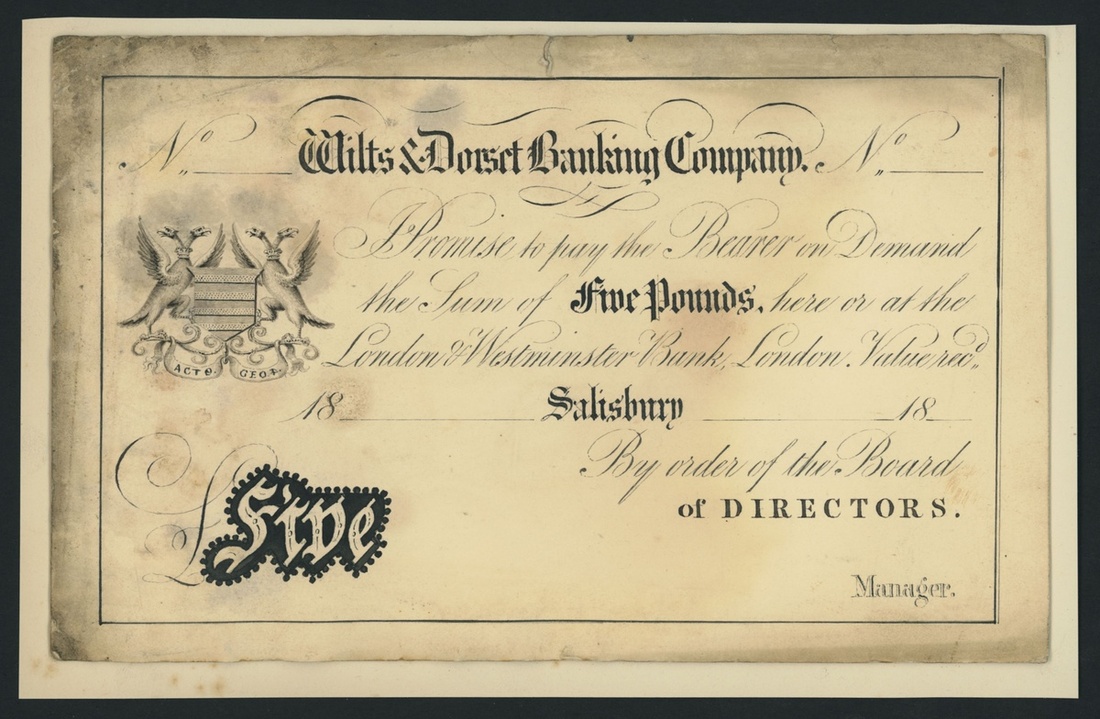 Wilts & Dorset Banking Company, proof £5, Salisbury, dated 18-- hand drawn, the Wilts & Dorset Banking Co. is listed circa. 1835-1883 under Outing 1890, uniface,