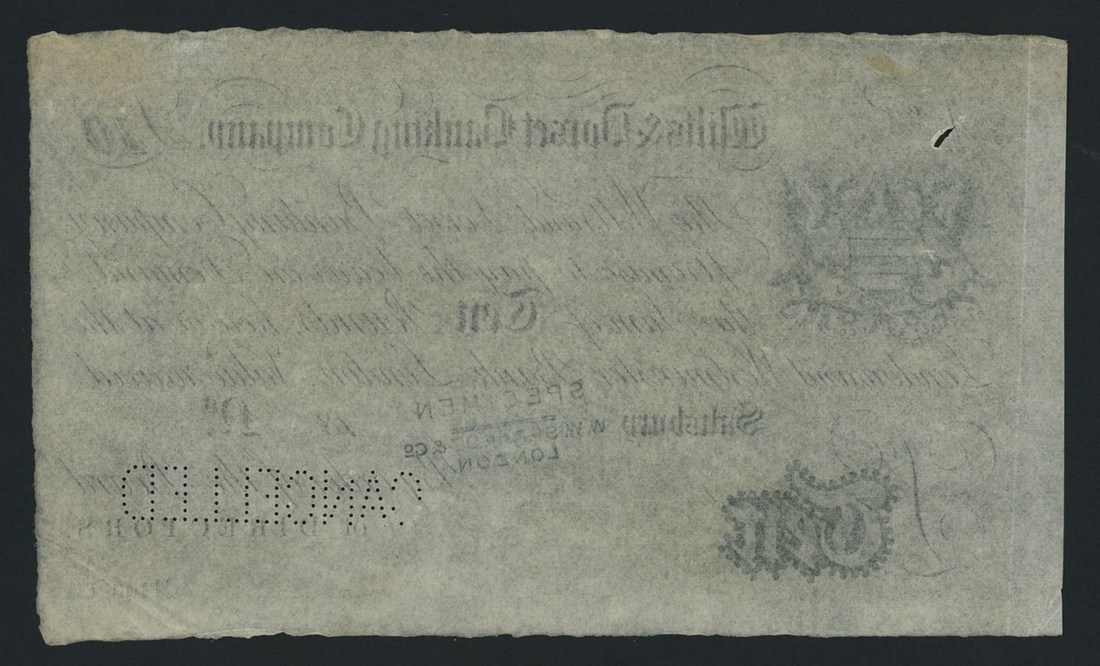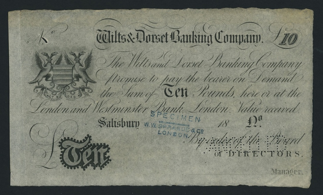 Wilts & Dorset Banking Company, specimen £10, Salisbury, dated 18-- perforated 'CANCELLED', stamped 'SPECIMEN W. W. SPRAGUE', Wilts & Dorset Banking Co. is listed circa. 1835-1883 under Outing 1890, however this denomination is unlisted, uniface,