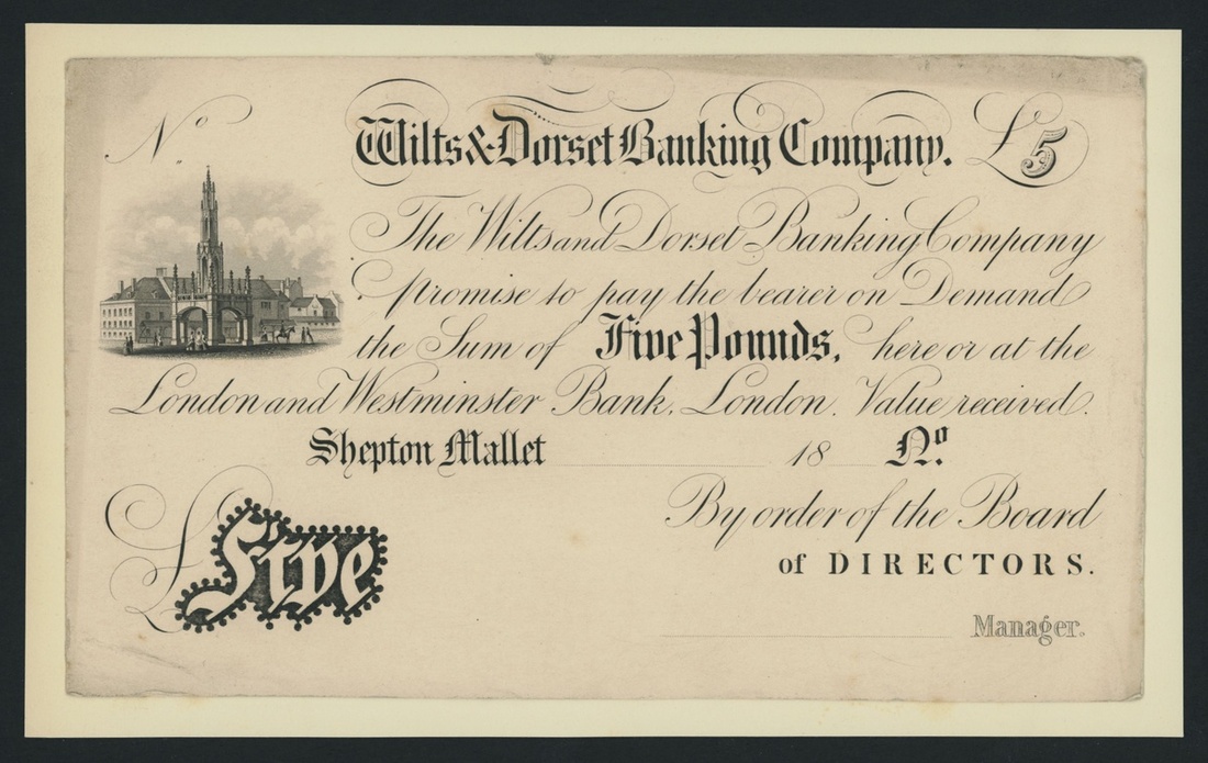 Wilts & Dorset Banking Company, proof £5, Shepton Mallet, dated 18--, the Wilts & Dorset Banking Co. is listed circa. 1835-1883 is listed under Outing 1890 for Salisbury, which is the Head Office for this bank. This bank is unlisted in Outing in association with Shepton Mallet, uniface,