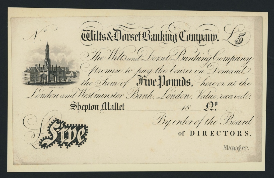 Wilts & Dorset Banking Company, proof £5, Shepton Mallet, dated 18--, the Wilts & Dorset Banking Co. is listed circa. 1835-1883 is listed under Outing 1890 for Salisbury, which is the Head Office for this bank. This bank is unlisted in Outing in association with Shepton Mallet, uniface,