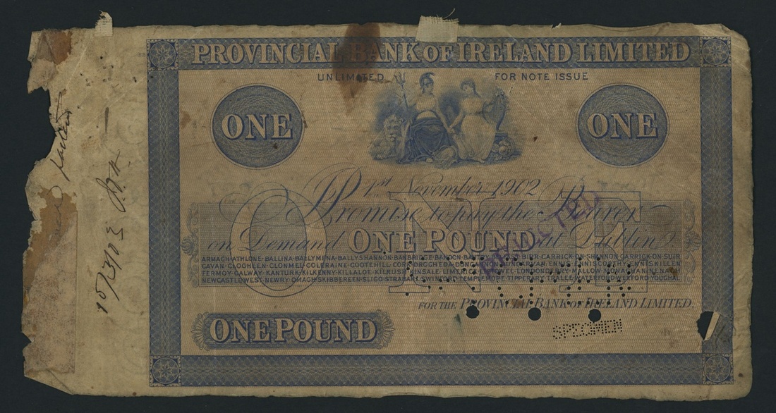 Provincial Bank of Ireland Limited, proof £1, Dublin, 1st November 1902, stamped 'REJECTED', perforated 'SPECIMEN' and hole punched,