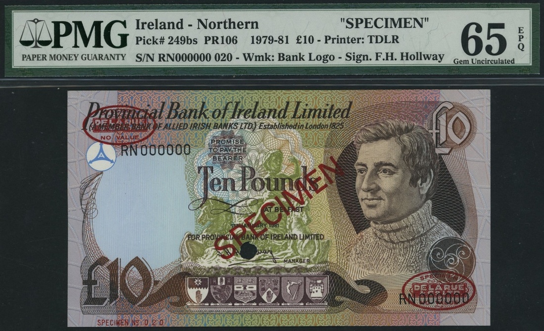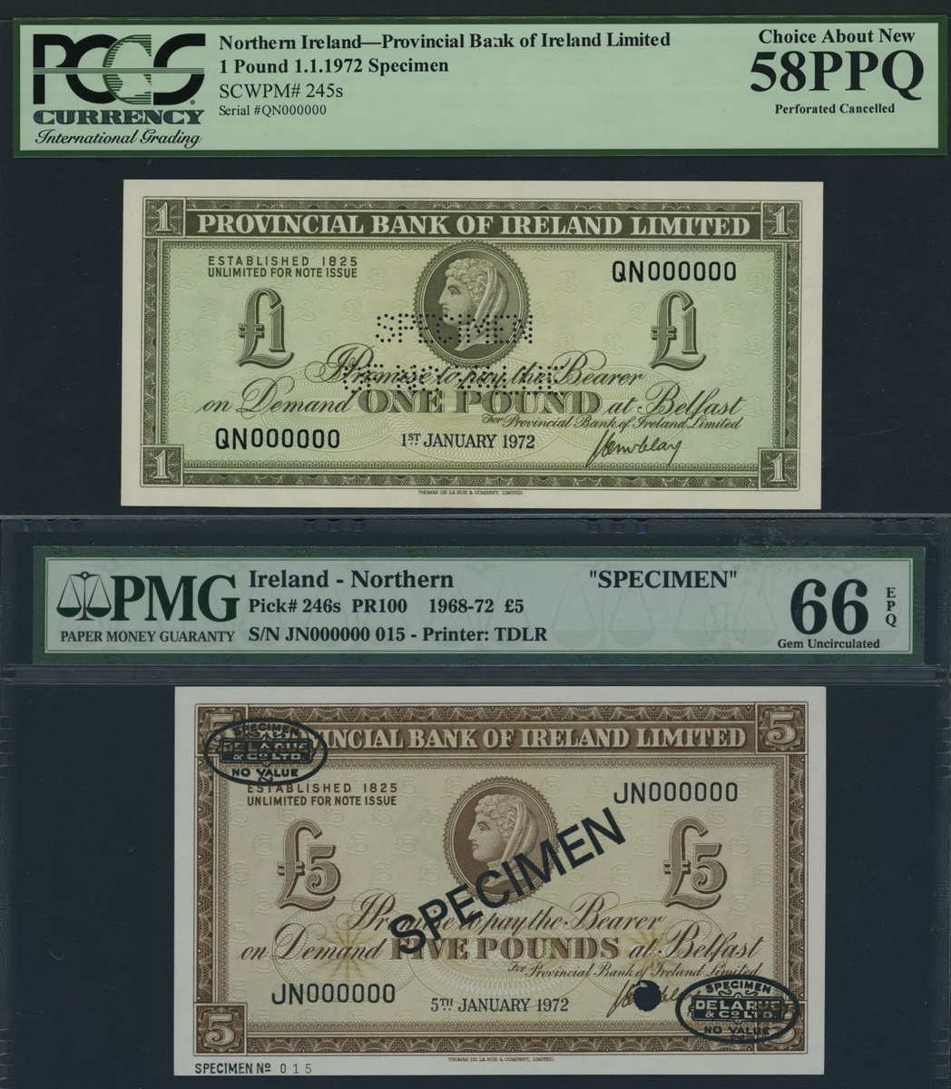 Provincial Bank of Ireland Limited, [3 notes] specimen £1, £5, £10, Belfast, 1972-1981,