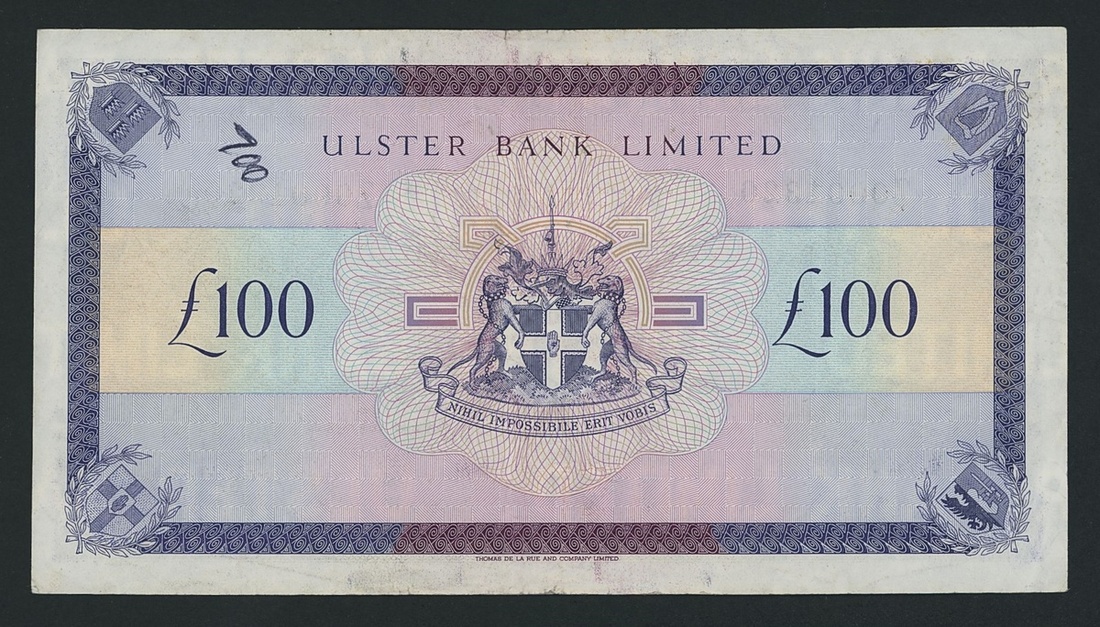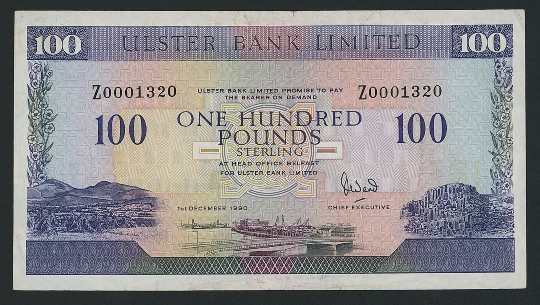 Ulster Bank Limited, replacement £100, Belfast, 1st December 1990, serial number Z0001320, last £100 replacement note for this date issued,