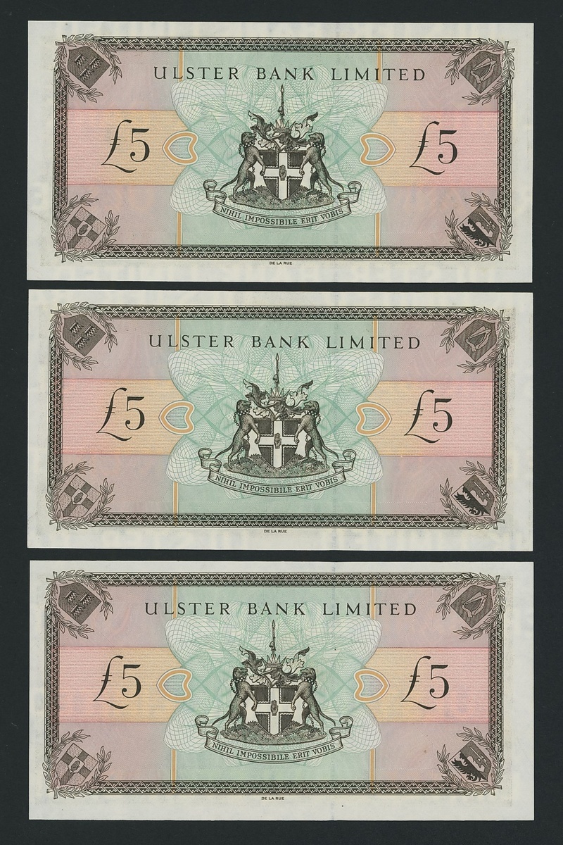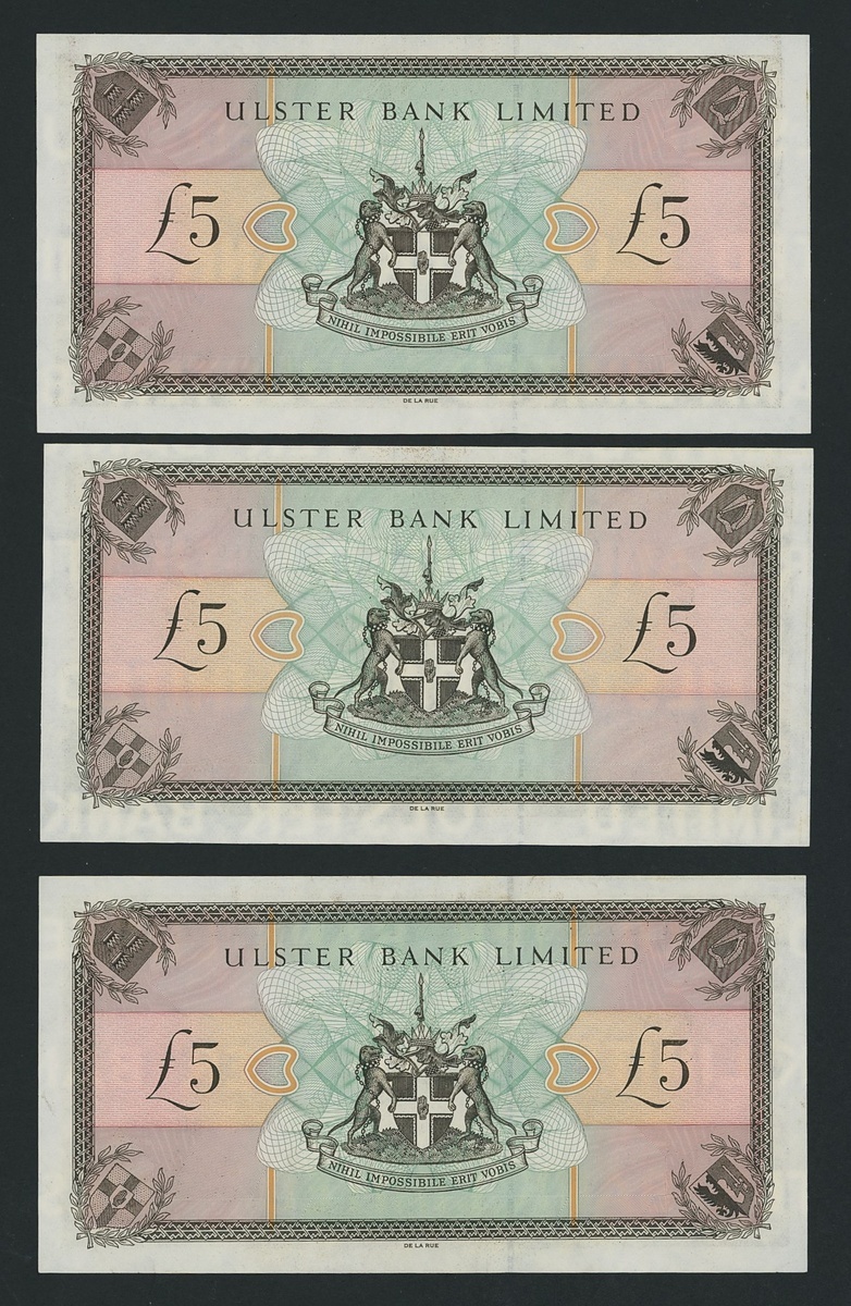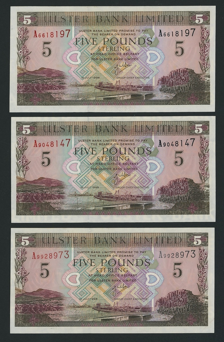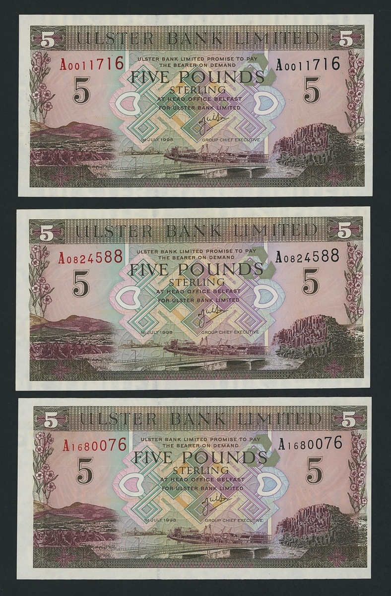 Ulster Bank Limited, [6 notes] £5, Belfast, 1st July 1998, serial numbers A0011719, A0824588, A1680076, A6618197, A9048147, and A9928973,