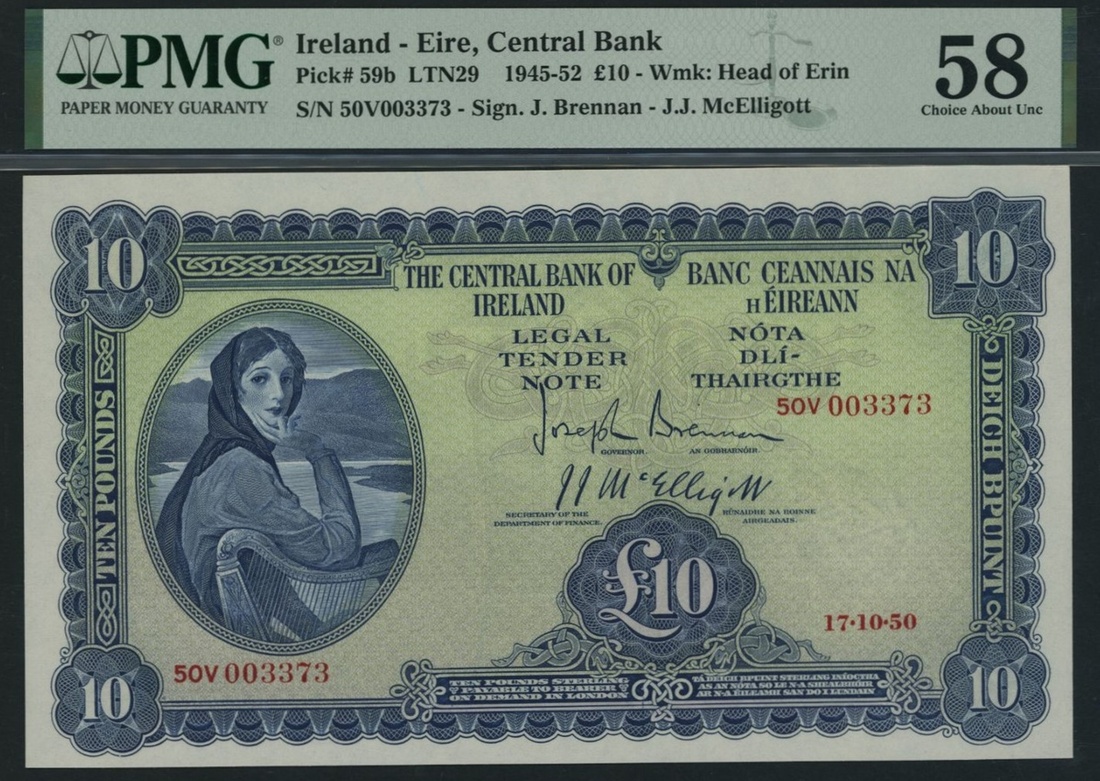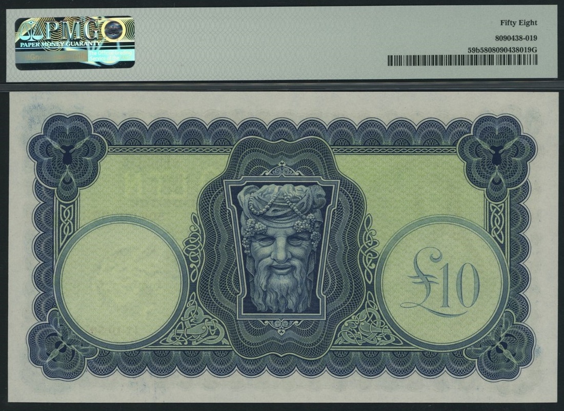 (x) Central Bank of Ireland, £10, 17th October 1950, serial number 50V 003373, (Pick 59b), in PMG holder 58 Choice About Uncirculated