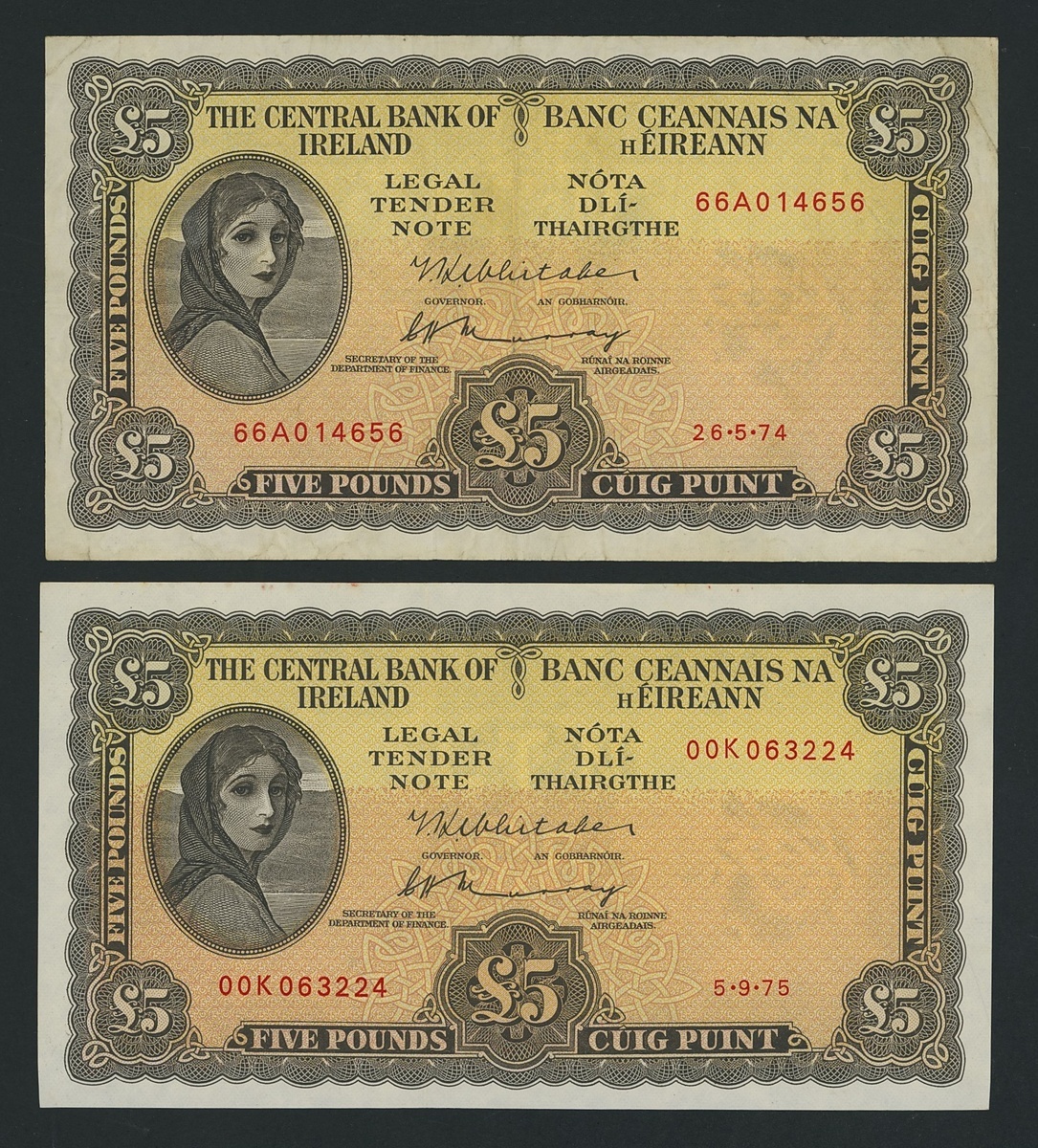£5, 5.9.75 (2), serial numbers 00K063224 and 01B250855,