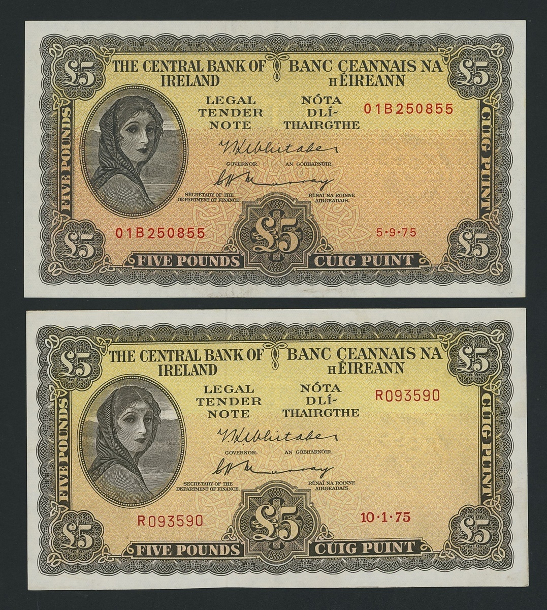 £5, 10.1.75 (2), serial numbers R093590 and 89A375582,