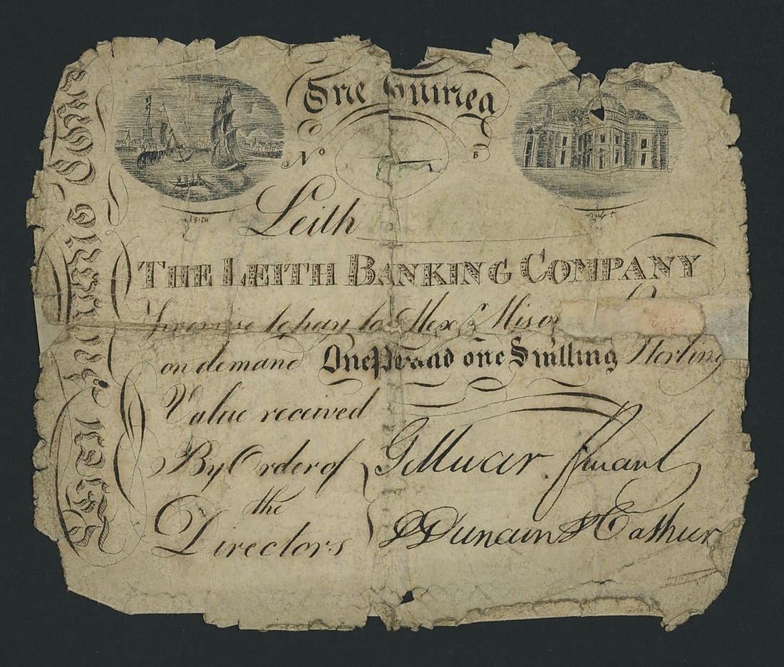 (x) Leith Banking Company, Scotland, 1 Guinea, Leith, undated, signatures of one Gillwar Stuart and D. Duncan -- most likely a contemporary forgery of the type first issued in 1817. Vignettes of ships at sail top left and bank head office top right,