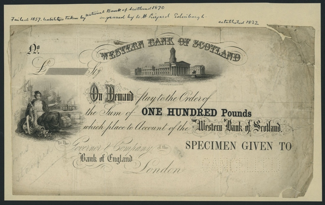 Western Bank of Scotland, specimen £100, London, undated, perforated 'CANCELLED', an exceptional design unlike those listed, connecting the Western Bank of Scotland to the Bank of England, uniface,