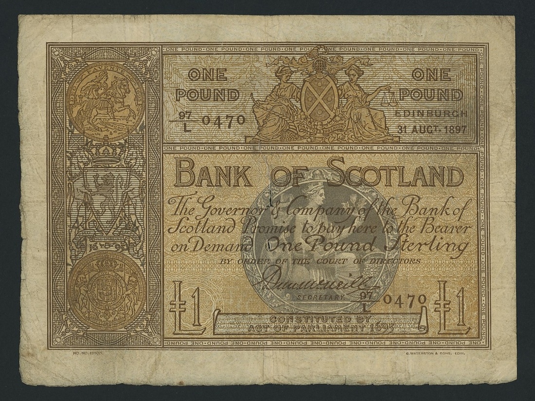 (x) Bank of Scotland, £1, Edinburgh, 31st August 1897, serial number 97/L 0470, (PMS BA 89b), vertical tear in body from hard centre fold, very good.