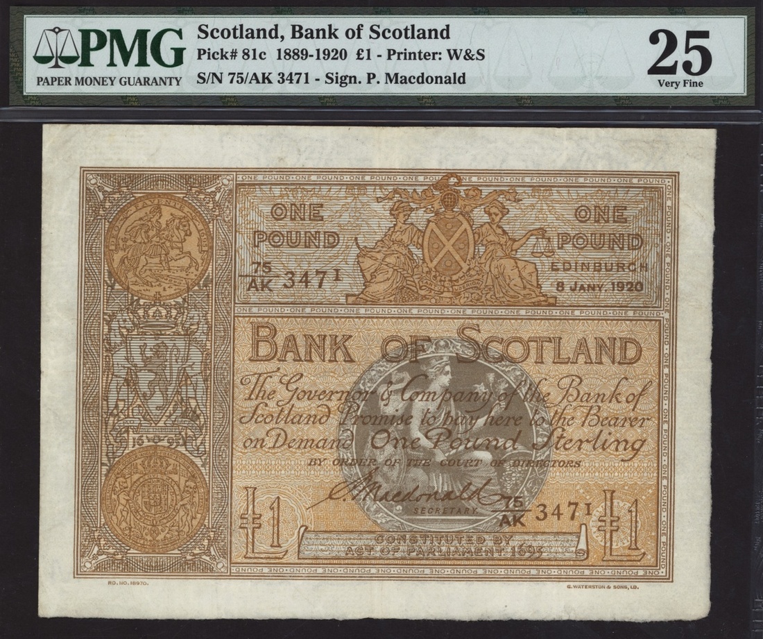 Bank of Scotland, £1, Edinburgh, 8th January 1920, serial number 75/AK 3471, (PMS BA 89d, Pick 81c), in PMG holder 25 Very Fine