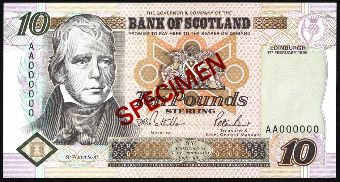(x) Bank of Scotland, specimen £10, 1 February 1995, prefix AA, (PMS BA123as), counting flick at right, otherwise uncirculated