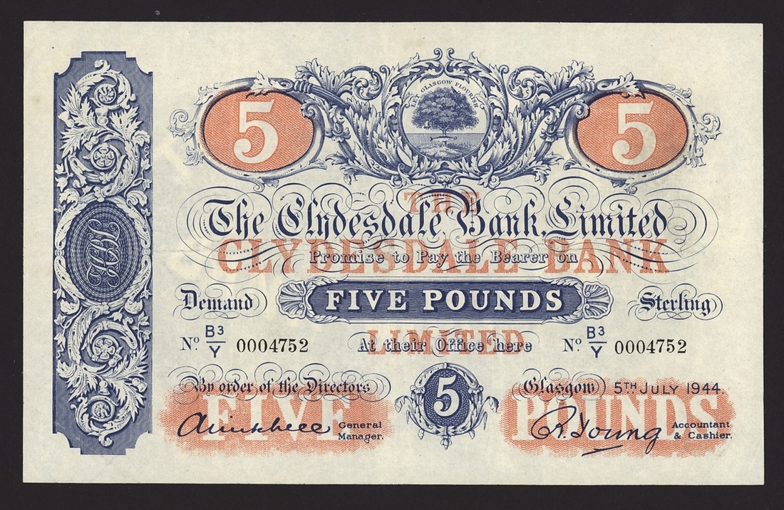 Clydesdale Bank Limited, £5, Glasgow, 5th July 1944, serial number B3/Y 0004752, (PMS CL 20e), very fine