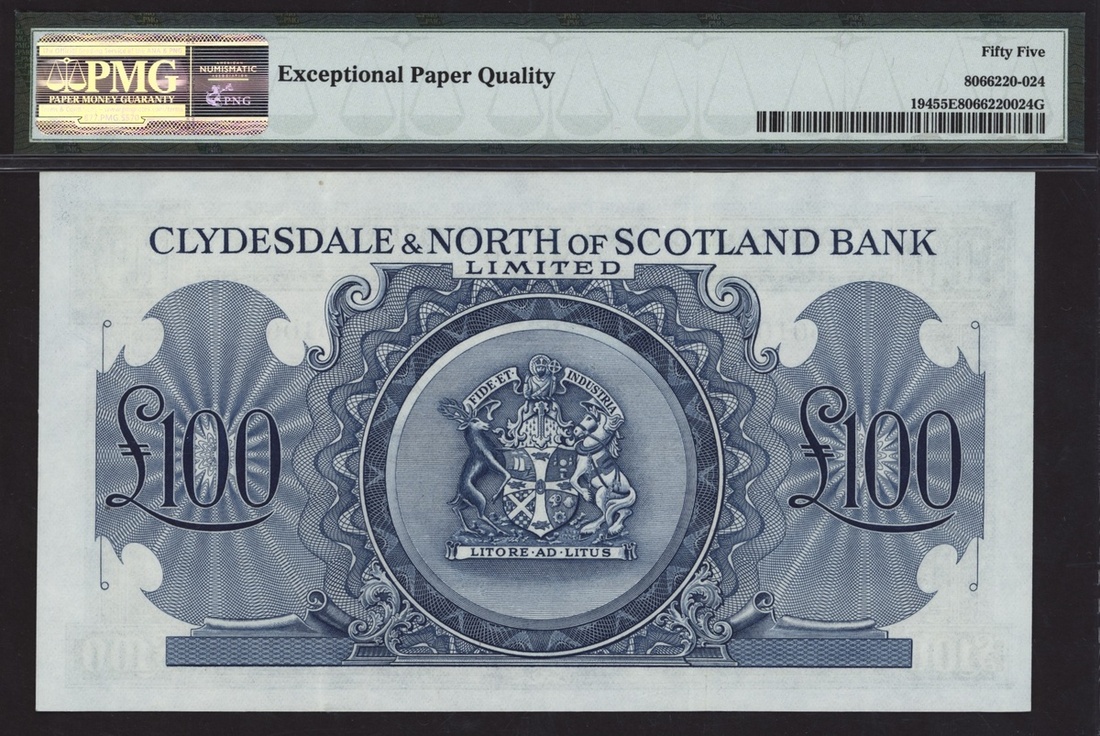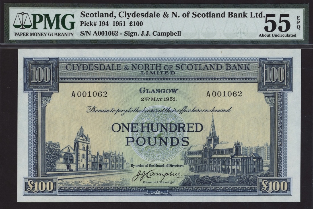 Clydesdale & North of Scotland Bank Limited, £100, Glasgow, 2nd May 1951, serial number A001062, (PMS CL 27a, Pick 194), in PMG holder 55 EPQ About Uncirculated