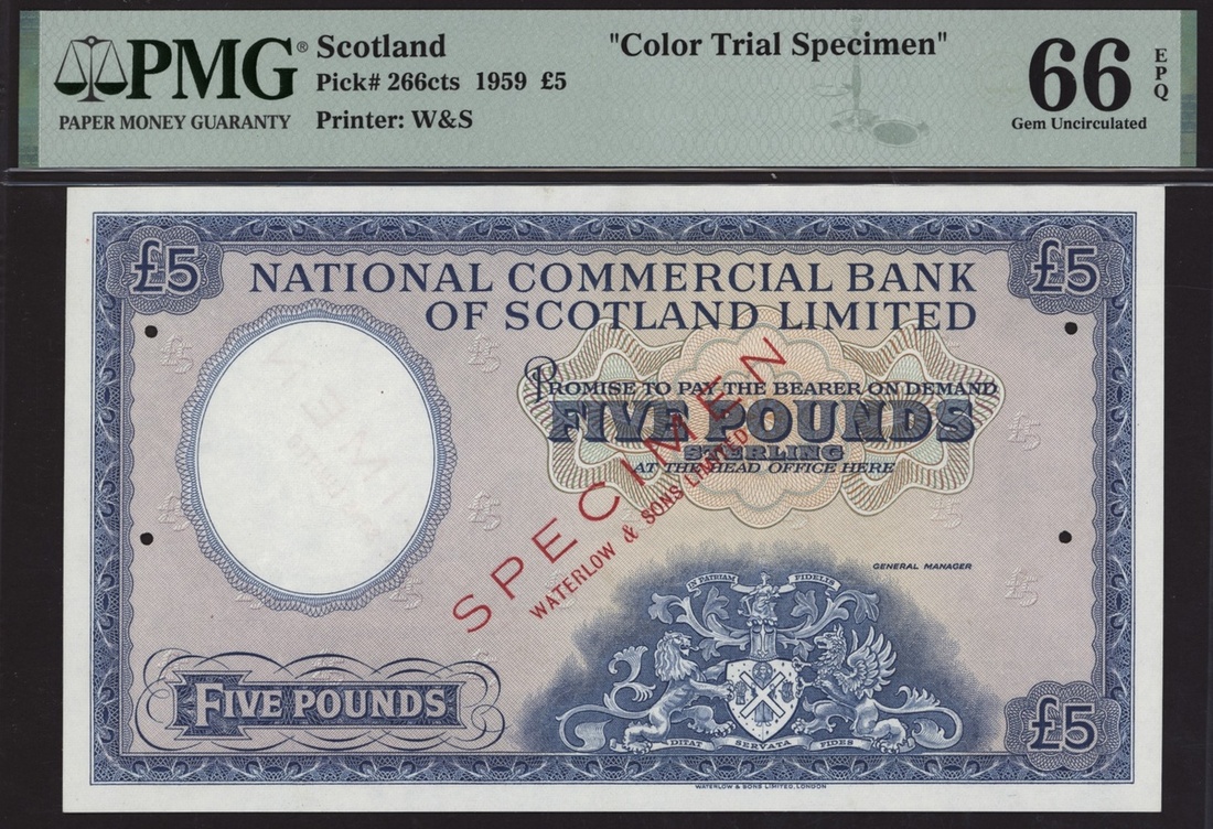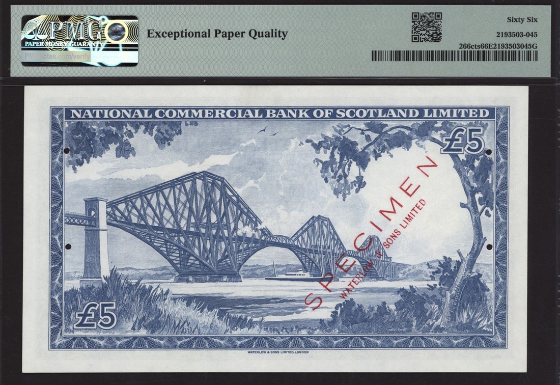 National Commercial Bank of Scotland Limited, colour trial specimen £5, ND (1959), (PMS NC 2), in PMG holder 66 EPQ Gem Uncirculated