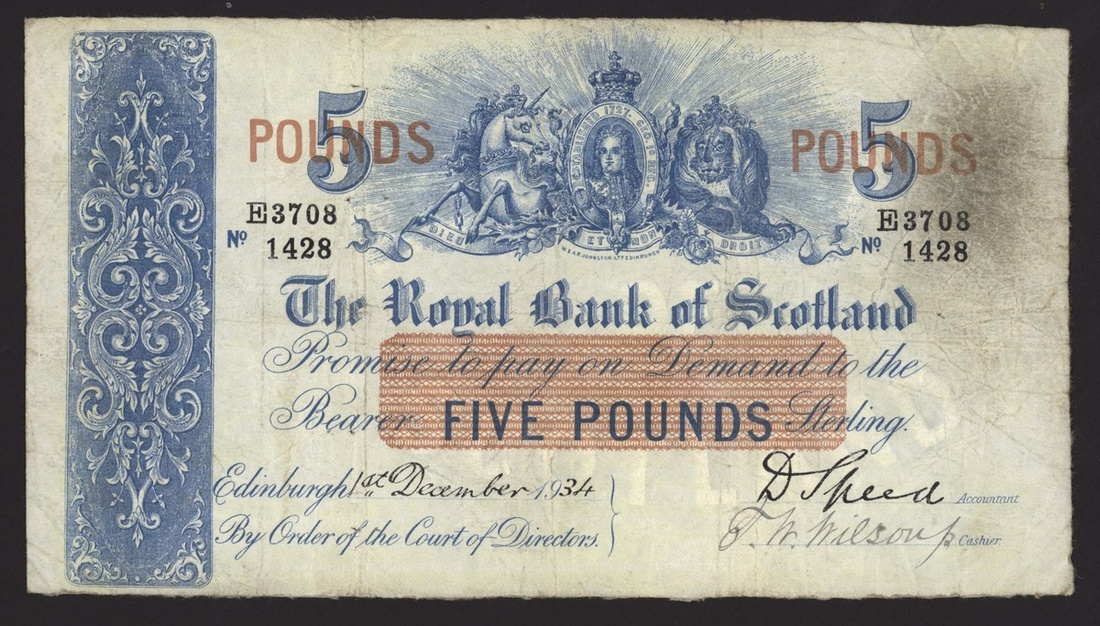 (x) The Royal Bank of Scotland, £5, Edinburgh, 1st December 1934, serial number E3708/1428,