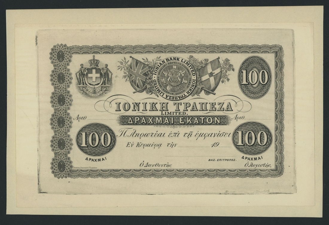 Ionian Bank Limited, proof 100 Drachmai, Corfu, dated 19--, a fantastic proof, uniface,
