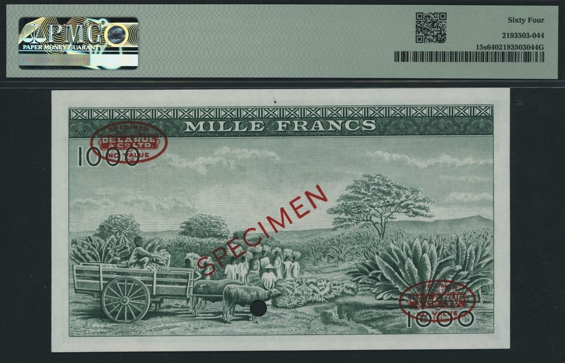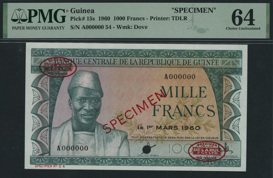 Banque Centrale de la Republique de Guinee, specimen 1000 Francs, 1st March 1960, serial number A000000, specimen number 54, (Pick 15s, BNB 304as1), in PMG holder 64 Choice Uncirculated, only 5 notes graded higher on PMG Census