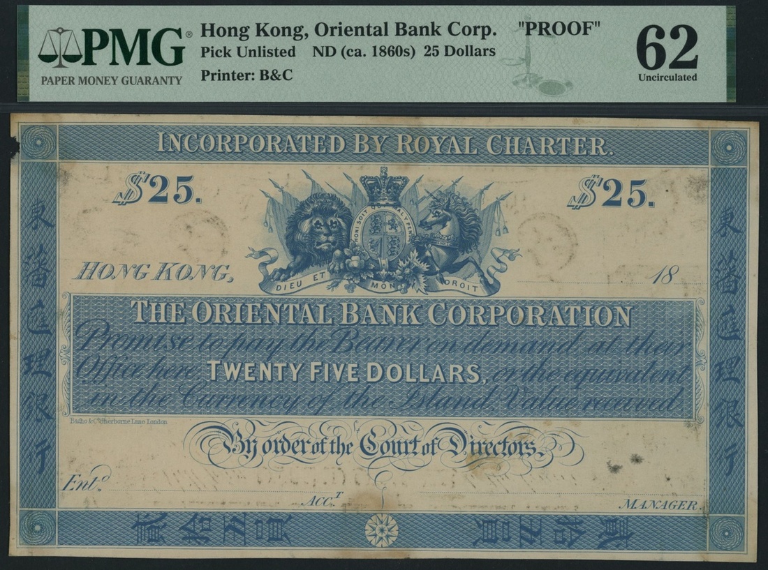 Oriental Bank Corporation, Hong Kong, [Discovery Note / Top Pop] coloured proof for a $25, 18- (ca. 1860s),