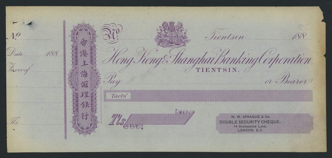 Hong Kong and Shanghai Banking Corporation, China, proof cheque, Tientsin, Taels denomination, dated 188-, selvage attached, uniface,