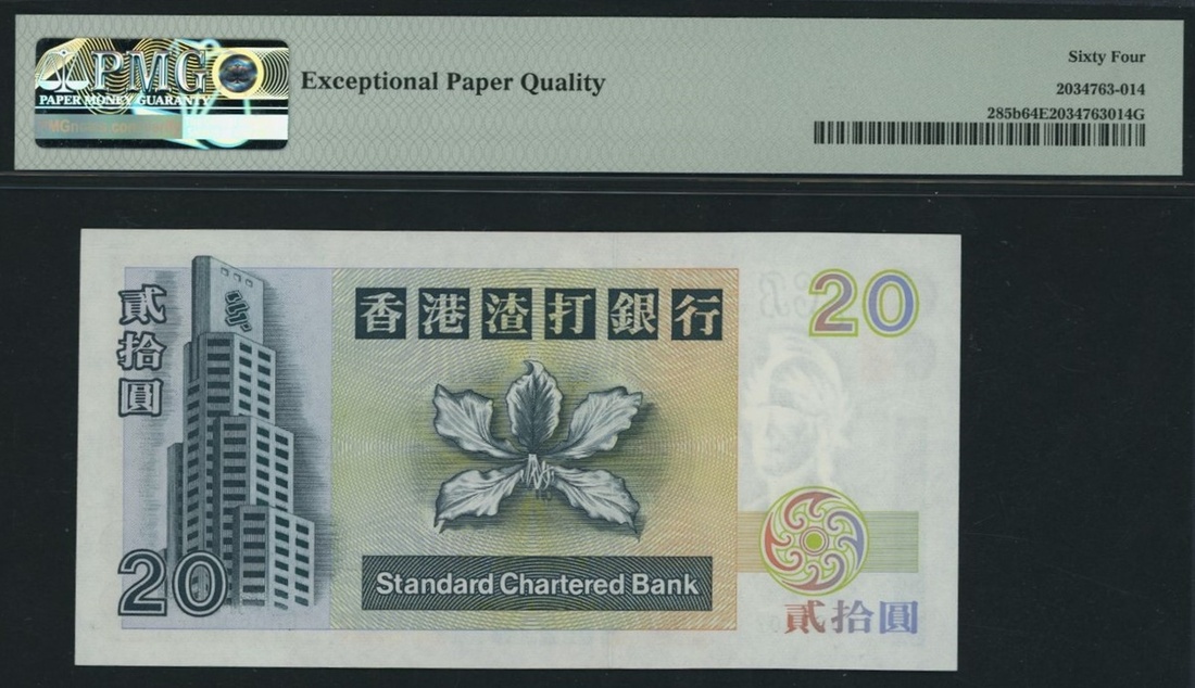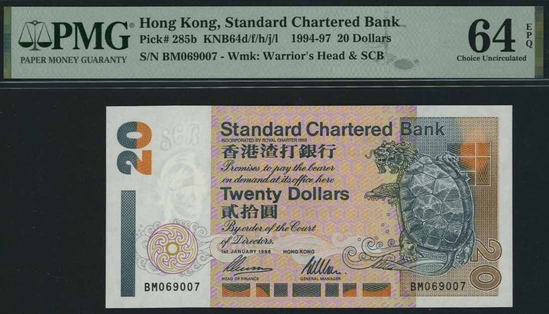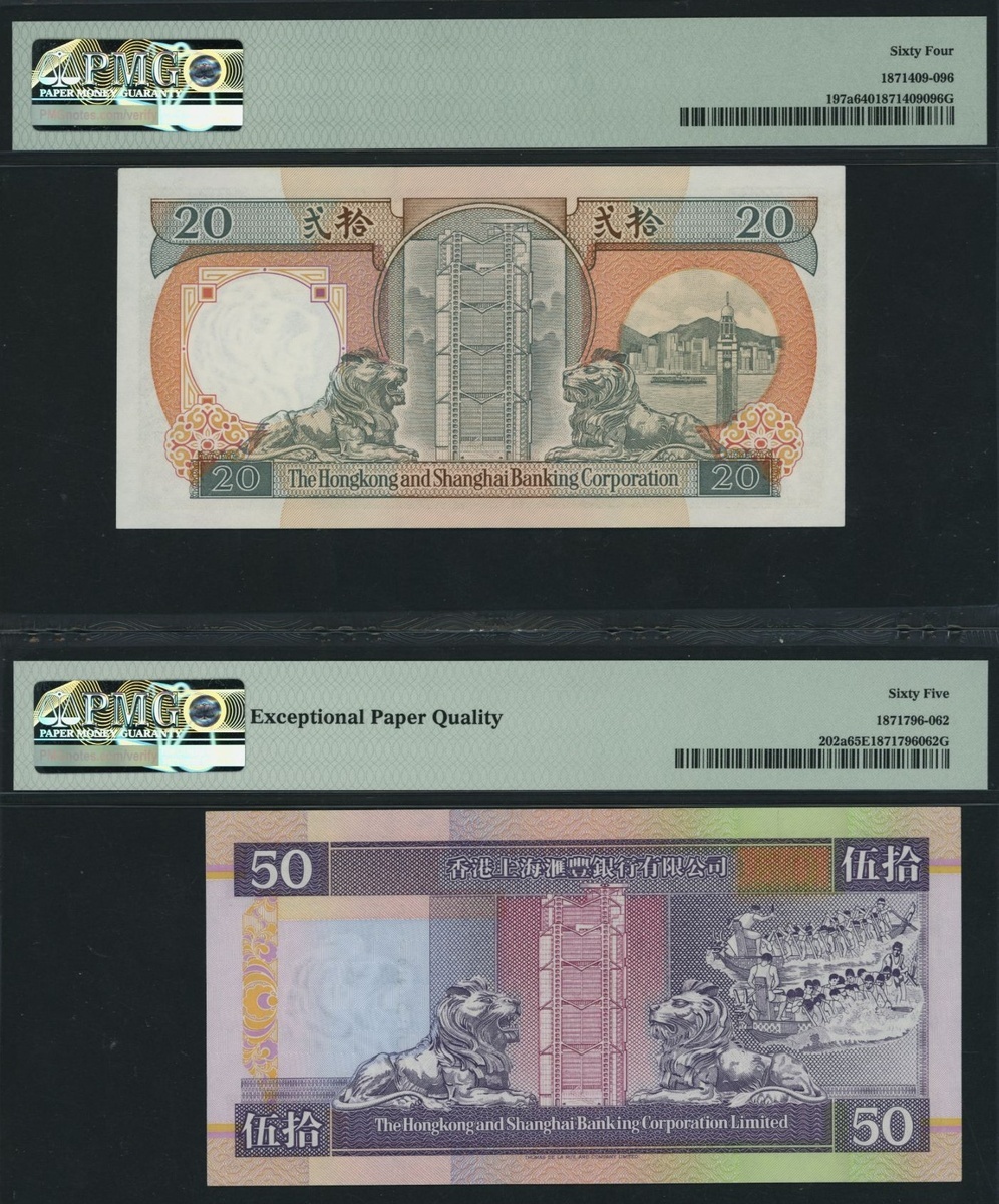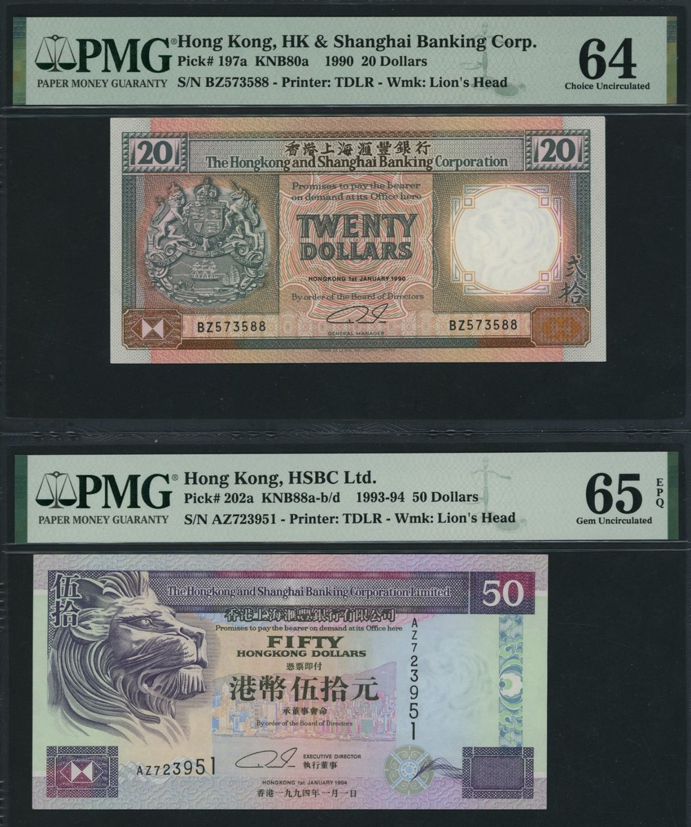 HSBC, Hong Kong, pair of 20, 20, & 50 dollars, 1990, 1994-97, 1993-94, (Pick 197a, 285b, 202a), in PMG holder 64 Choice Uncirculated, 64 EPQ, 65 EPQ Gem Uncirculated (2 notes)