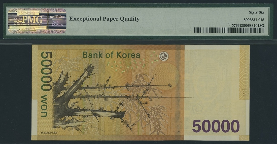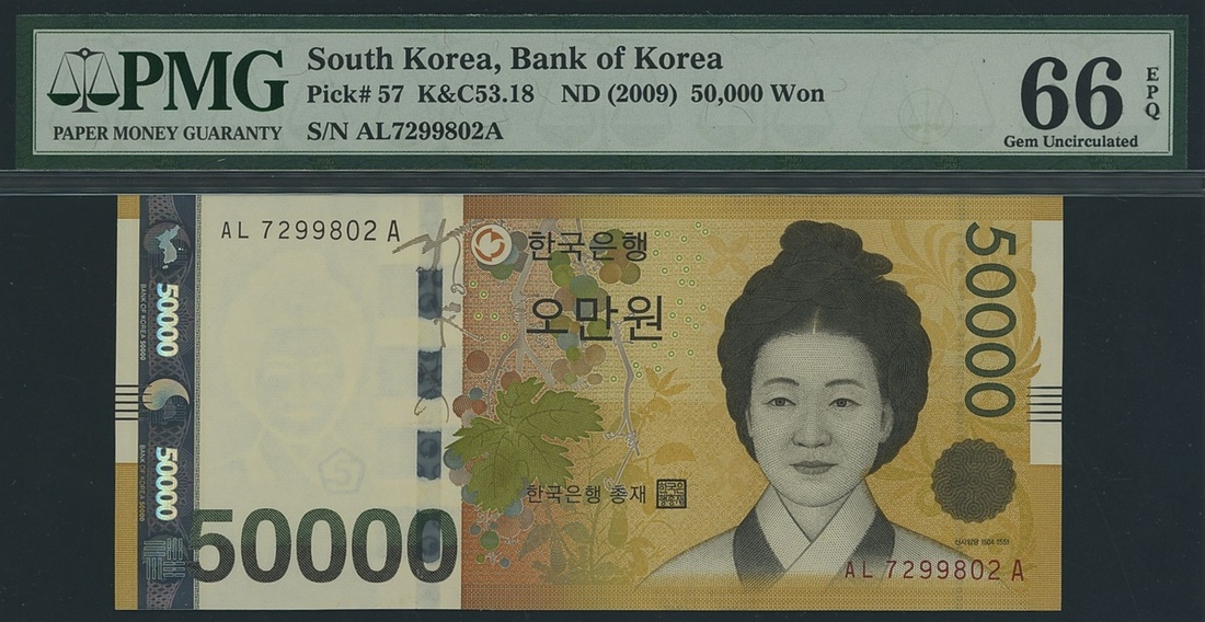 (x) Bank of Korea, South Korea, 50,000 Won, ND (2009), serial number AL7299802A, (Pick 57), in PMG holder 66 EPQ Gem Uncirculated