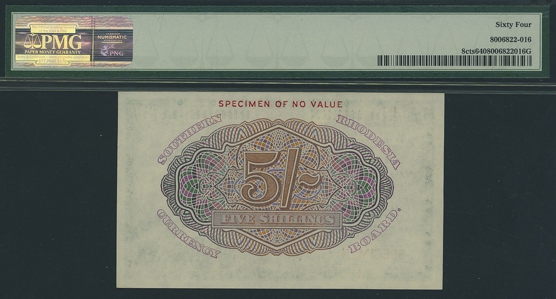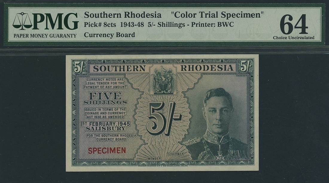 (x) Southern Rhodesia Currency Board, colour trial specimen 5 Shillings, Salisbury, 1st February 1945, (Pick 8cts), in PMG holder 64 Choice Uncirculated