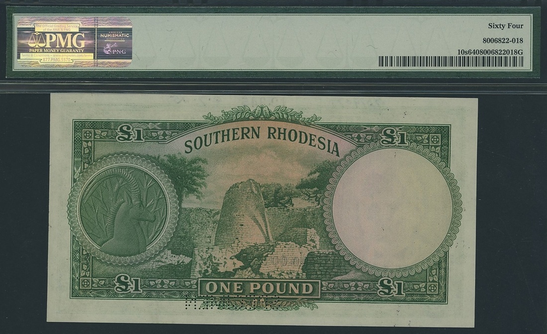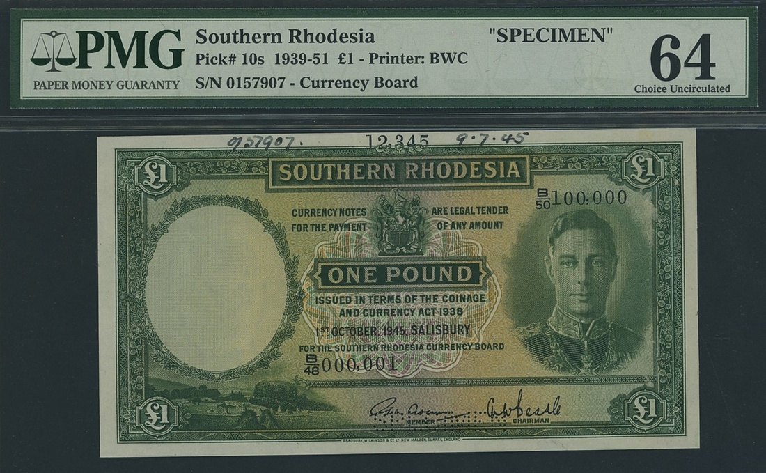 (x) Southern Rhodesia, specimen £1, Salisbury, 1st October 1945, serial number B/48 000,001 B/50 100,000, 0157907, (Pick 10s), in PMG holder 64 Choice Uncirculated