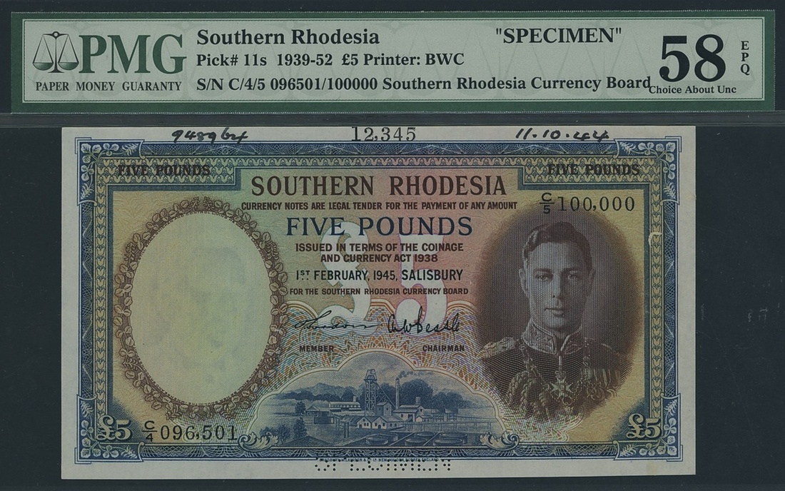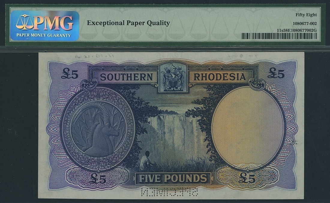 (x) Southern Rhodesia, specimen £5, Salisbury, 1st February 1945, serial number C/4/5 096501/100000, (Pick 11s), in PMG holder 58 EPQ Choice About Uncirculated