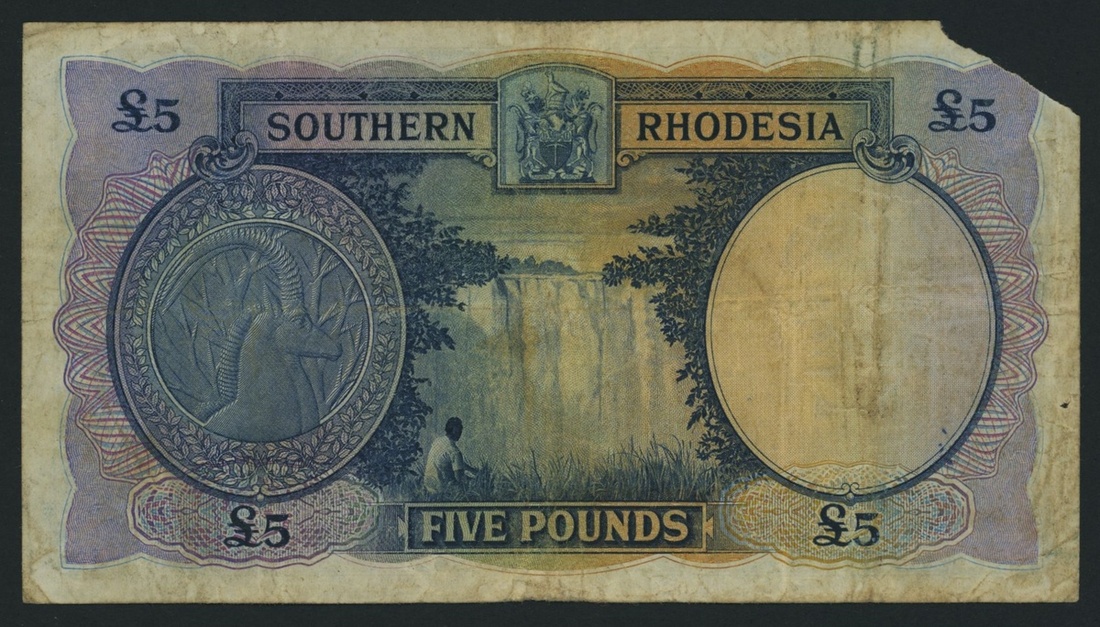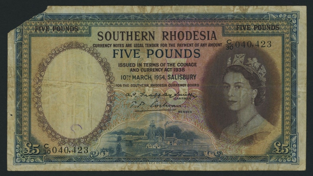 Southern Rhodesia Currency Board, 5 Pounds, Salisbury, 10th March 1954, serial number C/30 040423, signatures: T. P. M. Cochran and A. P. Grafftey-Smith,