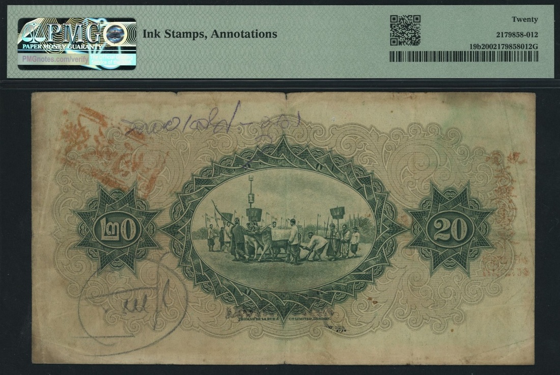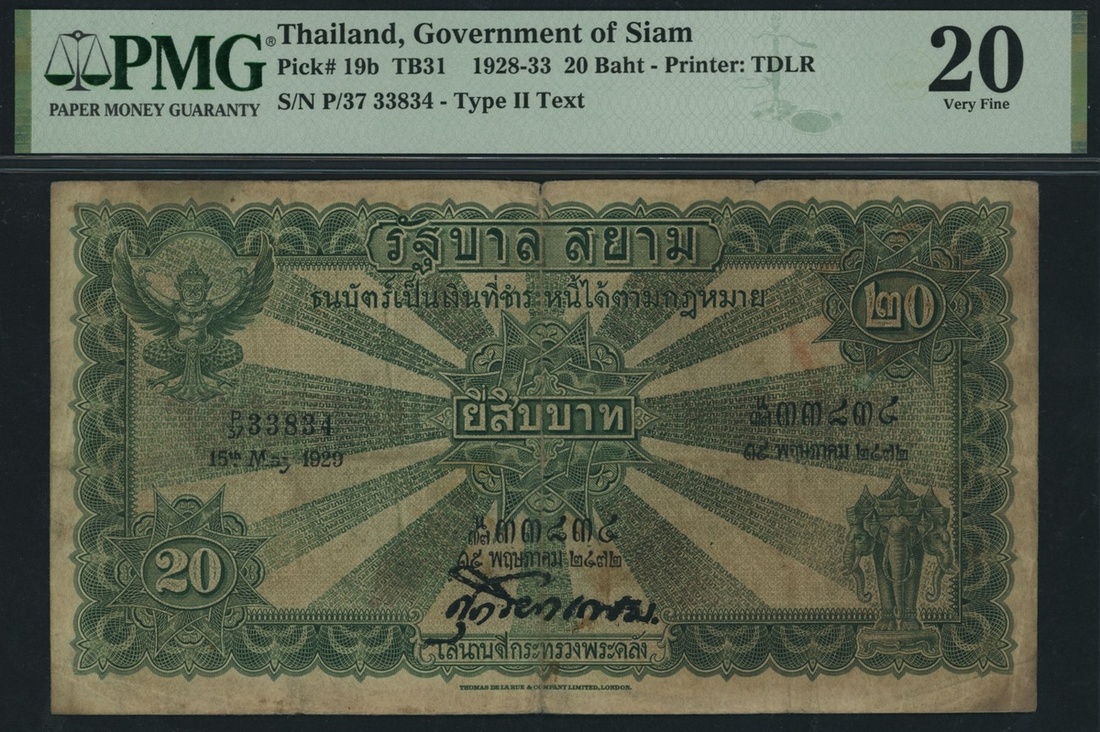 (x) Government of Siam, Thailand, 20 Baht, 15th May 1929, serial number P/37 33834, (Pick 19b), in PMG holder 20 Very Fine, ink stamps, annotation