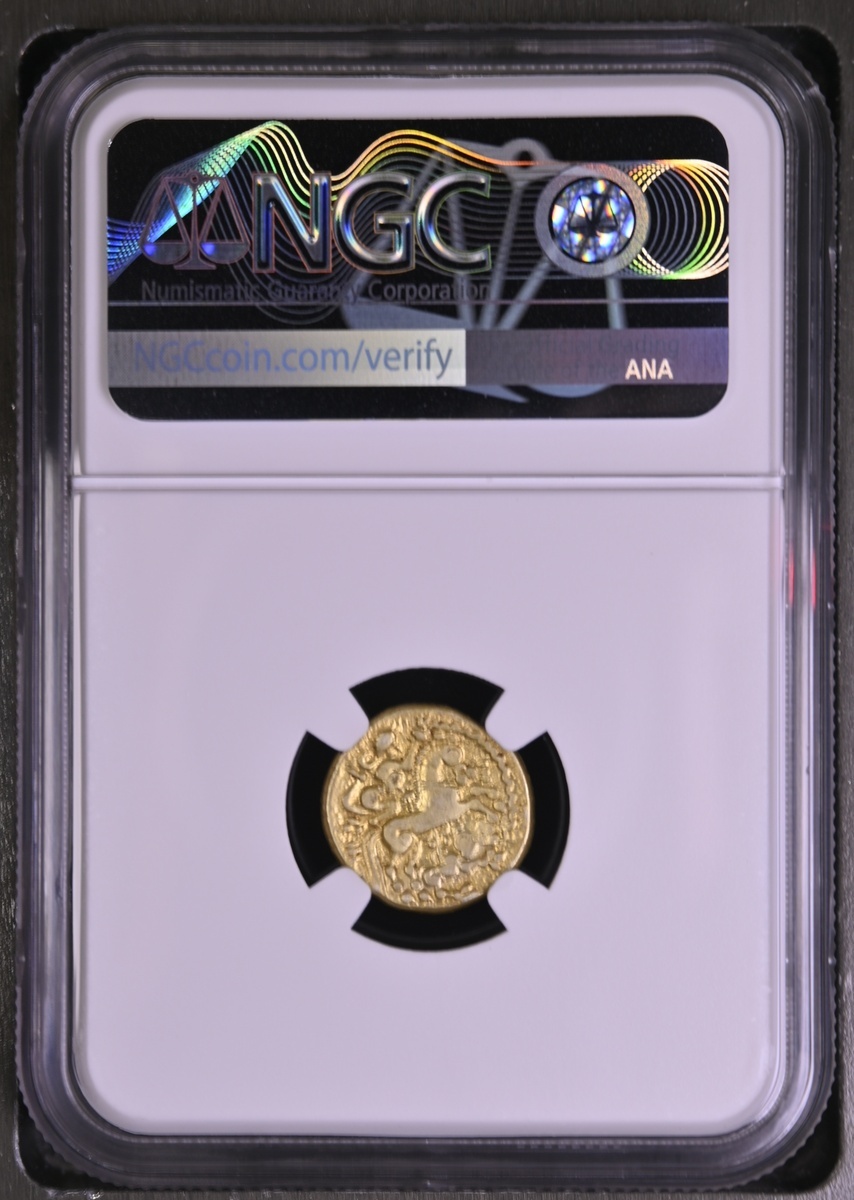 NGC Choice VF | Gaul, Aulerci Eburovices, Electrum Hemistater, c. 225-175 BC, devolved head of Apollo right, rev. devolved charioteer driving chariot right, wolf below, pseudo-Menander pattern in front, 3.73g [57.56grns], 11h (cf. Delestrée & Tache 2387; cf. Sills 196-198; cf. De La Tour 7170), softness upon tops of devices, nonetheless a pleasingly centred strike, about very fine, in NGC 'Ancients' holder, graded Choice Very Fine (Cert. #6290543-011) (Strike: 4/5 Surface: 4/5)