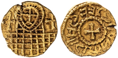 Anglo-Saxon England, Bishops of York (c. 620-655), Gold Shilling (65% AV), York Group, Inscriptional type 2, Variety Ci, enrobed effigy facing over segmented wall, with pellet eyes and bifurcated cross form features, flanked by cross pattée in fields, rev. SANCTE VIA DCS EF(V), central cross pattée in beaded circle, 1.310g [20.22grns], 10h [?] (SCBI 69 [Abramson], 6 [and Spink Sale II, 335] same dies; A&W, type V. xxi; North 27; S.762), some peripheral striking softness and with a resultant fissure at 11 o'clock, otherwise pleasingly well-centred and uniformly bold devices, a pleasing very fine, extremely rare and of great socio-religious significance to the British numismatic record dating to the birth of Christianity on the island being struck at its epicentre