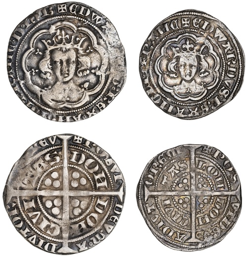 Edward III (1327-1377), Pre-Treaty Period, Groat, Series C, London, 1351-1352, crowned facing bust, rev. CIVITAS LONDON, long cross, three pellets in angles, 3.94g [60.80grns], 11h, m.m. cross 1 (North 1152; S.1565); and Halfgroat, Series C, 1351-1352, London, similar, 2.18g [33.64grns], 11h [to i.m.] (North 1148; S.1574), some clipping to both, softness to the Groat, but otherwise pleasingly toned with remaining fine detail, the Groat about very fine, the other very fine (2)