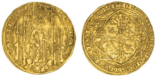 Anglo-Gallic, Edward the Black Prince (1362-1372), Second Issue, Noble Guyennois à la rose (Pavillon d'Or), c. 1364, La Rochelle, ED : PO : GNS : REI ANGL : PNPS : AQVI, double voided quadrilobe stops, Prince standing holding sword, beneath ornate portico, ostrich feathers at sides, lions at feet, rev. + DNS : AIVTO :Z: PTECTO : ME :Z: IIPO : SPAIT : COR : MEVM : R, double rosette stops, cross quernée within ornamental quatrefoil, fleur-de-lis in first and third quarters, lions in second and fourth quarters, E at centre, trefoils in outer spandrels, 4.82g [74.38grns], 9h, m.m. R (Schneider III, 57-58 [E not reversed]; Elias 158; S.8123), some hairline die flawing to reverse, soft in parts and some blundering within legends, nonetheless well centred and pleasing to portico and feathers, nearing very fine, scarce