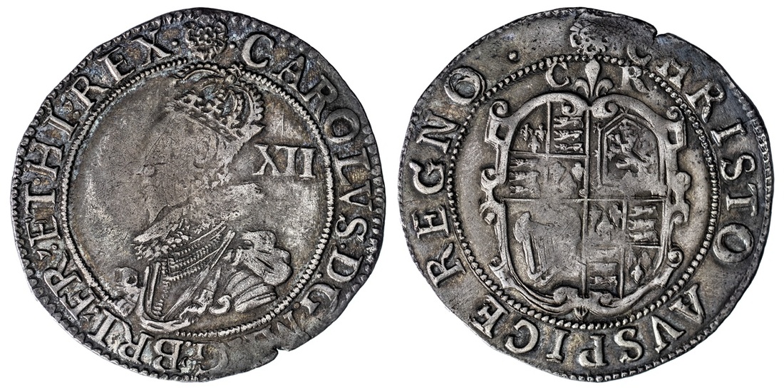 Charles I (1625-1649), Group B, Type 1b, Welsh 'Plumes' Shilling, Tower (under King), (m.m.) CAROLVS • D .' G .' MAG .' BR .' FR .' ET • HI .' REX • second crowned bust left, dividing legend, wearing ruff, XII behind, rev. • CHRISTO • AVSPICE • REGNO • (m.m.) • square-topped shield, plumes above, bird head harp, 5.56g [85.80grns], 2h, m.m. castle (Brooker 420; Sharp B2/2; North 2220; S.2785); and Group C, Type 2a, Shillings, Tower (under King) (2), (m.m.) • CAROLVS • D .' G .' MAG .' BRI .' FR .' ET • HI .' REX • third crowned bust left, wearing ruff, XII behind, rev. oval garnished shield, [lys above] dividing C-R, ornate harp, 5.65g [87.19grns], 7h, m.m. rose (Brooker 464; Sharp C2/3; North 2221; S.2787), a few nicks to the edge of the coins, slight crimp in the first and a few areas of softness, bold fine, the second soft to face, yet with a vibrant blue tone in the legends, nearing very fine (2)