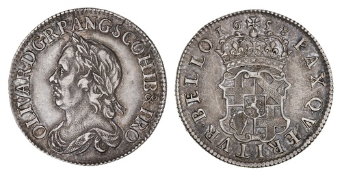 Oliver Cromwell, Shilling, 1658, by Thomas Simon, OLIVAR • D • G • R • P • ANG • SCO • HIB &c PRO, laureate and draped bust left, rev. PAX QVÆRITVR • BELLO, crowned shield of the Protectorate, edge milled, 5.96g, 6h (Lessen J28; ESC 1005; Bull 254 [S]; S.3228), usual die flawing before bust, rubbed to the higher points with some contract marking, otherwise deeply toned, good very fine