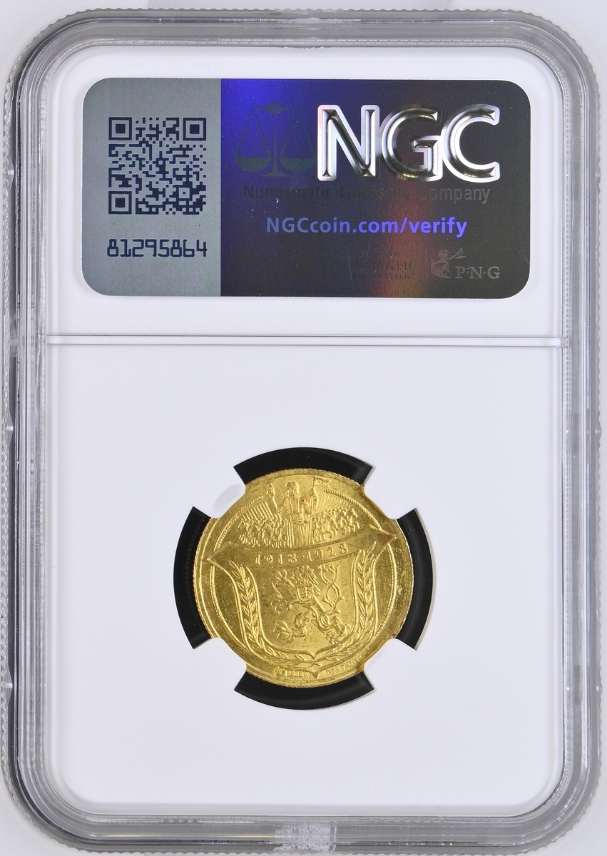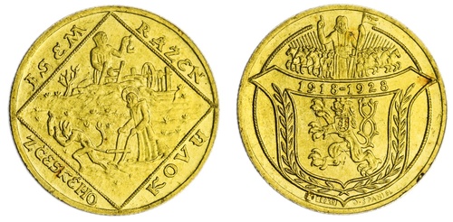 (g) NGC UNC | Czechoslovakia, First Republic (1918-1939), '10th Anniversary of the Republic, 1918-1928', Decennial Commemorative Medallic 2-Dukáty (2-Ducats), 1928, Kremnitz, by Otakar Španiel, JSEM RAŽEN Z CESKÉHO KOVU, Saint driving plough drawn by Devil left, Medieval miner ascending from ground by ladder, holding oil lamp, barren tree and machinery on either side; all within beaded square, rev. Coat-of-arms, bordered by laurel branches on either side, 1918-1928 above, arms surmounted by St. Wenceslas, raising hand in benediction and holding banner, knight on horseback, holding lances behind, .987 hallmark and K beneath shield, edge milled, 6.97g, 12h (Fb. 7; M&CH CSR1-MED1; KM XM3), hairline through shield, otherwise with much original mint lustre, extremely fine and scarce one year of issue type, only 1,000 pieces reportedly struck, in NGC holder, graded UNC DETAILS ~ Rev Scratched (Cert. #8222308-003)
