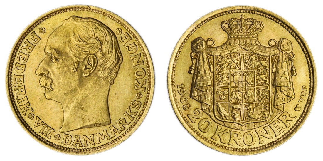 (g) Denmark, Frederick VIII (1906-1912), 20-Kroner, 1908 VBP, Copenhagen, bare head left, rev. crowned shield on mantle, edge milled, 8.96g, 12h (KM 810; Fb. 297), couple of hairlines to obverse, otherwise with a mint fresh lustre, extremely fine
