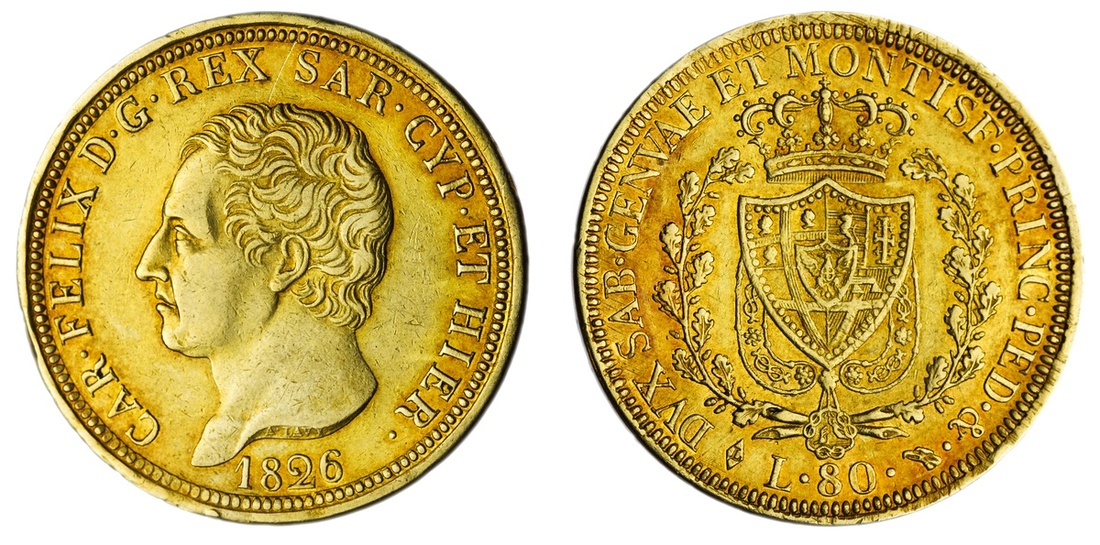(g) Italian States, Piedmont-Sardinia, Carlo Felice (1821-1831), 80-Lire, 1826 L, Turin, bare head left, rev. crowned shield and Garter within wreath, incuse lettered edge, 25.75g, 6h (Fr. 1133; KM 123.1), minor edge bruising and contact marking, hairline to portrait, residually lustrous and with a rich golden tone, very fine