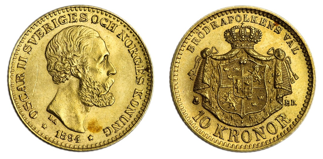 (g) Sweden, Oscar II (1872-1907), 10-Kronor, 1894 EB, Stockholm, bare head right, no dots to LA below truncation, rev. crowned shield on mantle, edge milled, 4.47g, 12h (Fr. KM 743), couple of toning spots and hairline behind head, otherwise with a full mint lustre, extremely fine