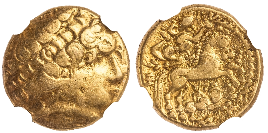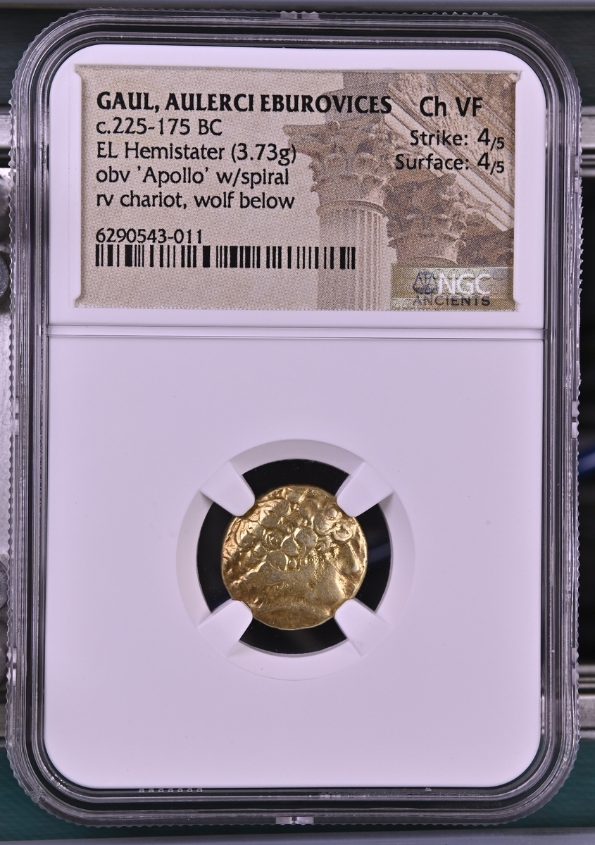 NGC Choice VF | Gaul, Aulerci Eburovices, Electrum Hemistater, c. 225-175 BC, devolved head of Apollo right, rev. devolved charioteer driving chariot right, wolf below, pseudo-Menander pattern in front, 3.73g [57.56grns], 11h (cf. Delestrée & Tache 2387; cf. Sills 196-198; cf. De La Tour 7170), softness upon tops of devices, nonetheless a pleasingly centred strike, about very fine, in NGC 'Ancients' holder, graded Choice Very Fine [Strike: 4/5 Surface: 4/5] (Cert. #6290543-011)